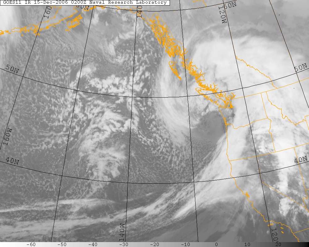 Infrared Satellite image of the Hanukkah Eve Storm on 12/14/06 @ 6 P.M. PST, courtesy of US Naval Research Laboratory